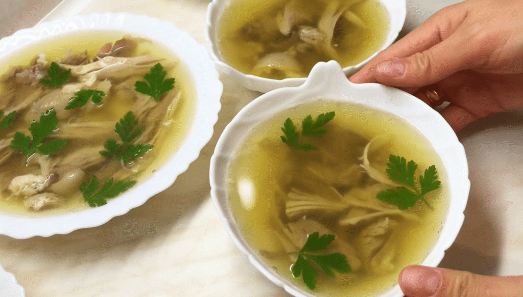 Разливаю бульон по тарелочкам и по желанию можно добавить в тарелочки петрушку.