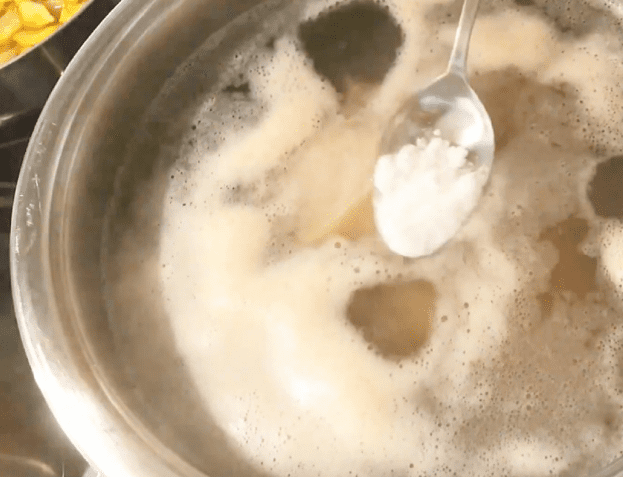 Ставлю кастрюлю на огонь и жду момента закипания. Когда начнёт появляться пена на поверхности, добавляю половину столовой ложки соли — благодаря соли пена лучше выйдет на поверхность.