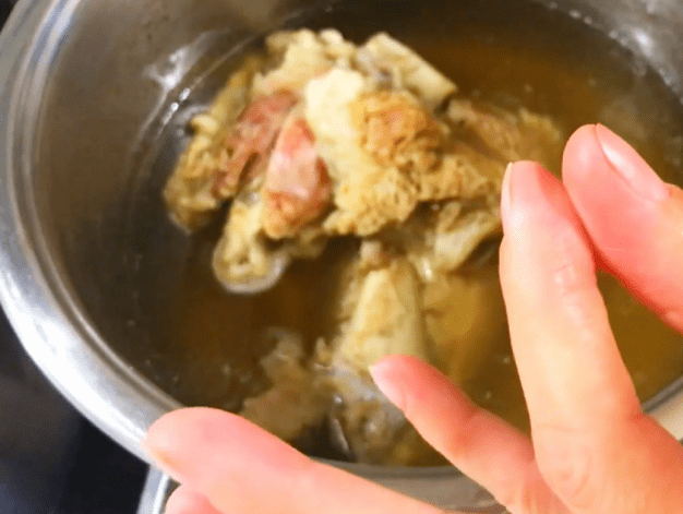 В общем холодец готовлю 5–7 часов. Мясо к этому времени будет отходить от кости. Определяю крепость и готовность бульона с помощью пальцев. Беру немного бульона без жира и размазываю его между пальцами, немного подую, чтобы бульон чуть подсох. Пальцы должны хорошо склеиваться. Если они легко разлепляются — значит готовлю ещё минут 40 и снова проверяю.