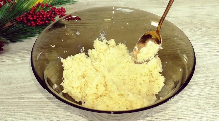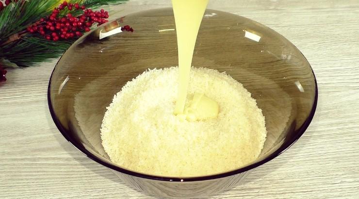 В кокосовую стружку добавляю сгущенку, в три мероприятия, нам нужно получить массу, которая хорошо держит форму и не рассыпается.
