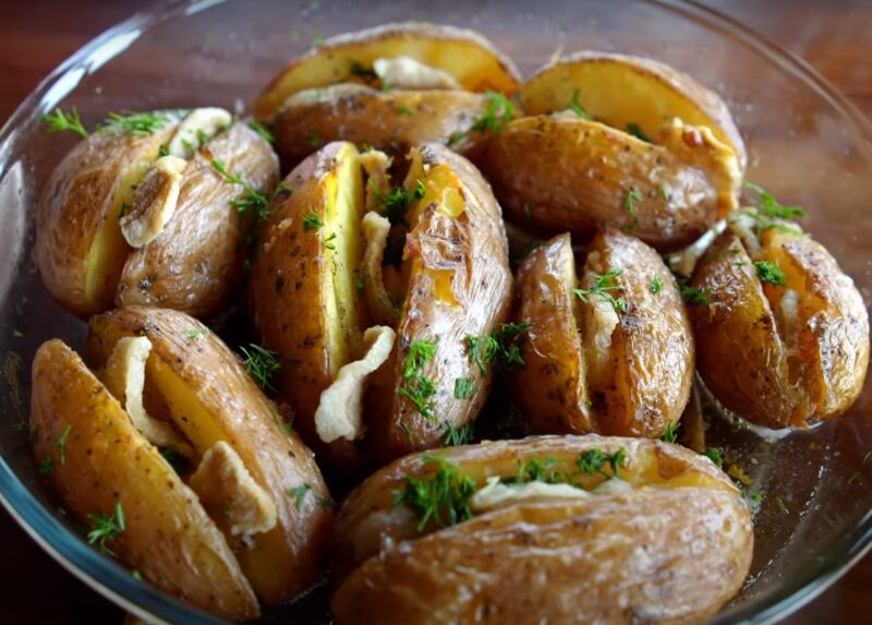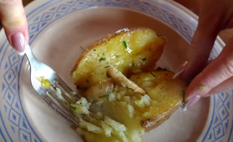 Кладем в отверстия сало и чеснок, поливаем остатками жира картошку. Кладем в форму для запекания картофель и запекаем при 180 градусах 10-15 минут.