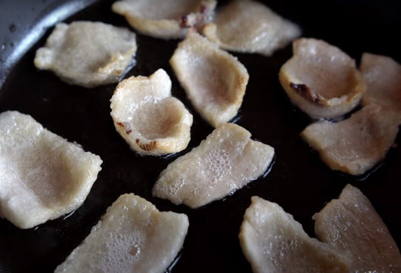 Когда сало приобретет золотую корочку, убираем его со сковороды. Разминаем зубчики чеснока и выкладываем в растопленное сало на сковороду.