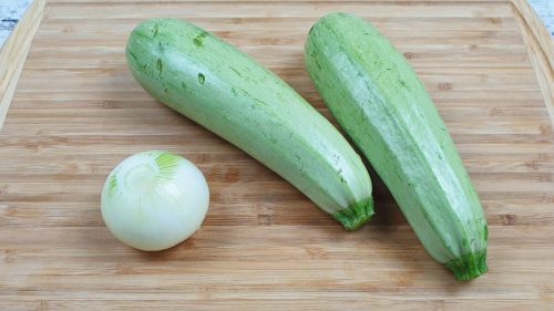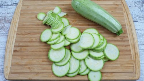 2 молодых кабачка нарезаем на тонкие слайсы.