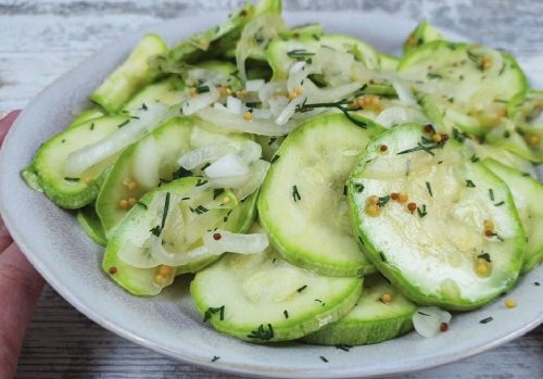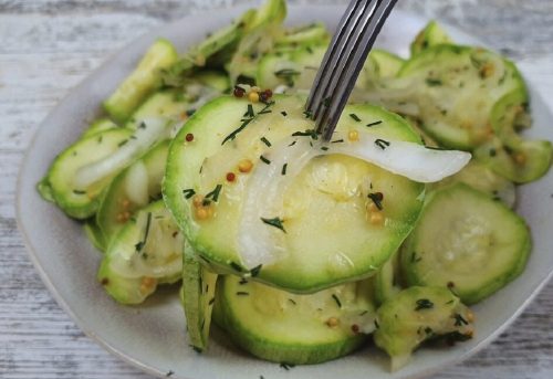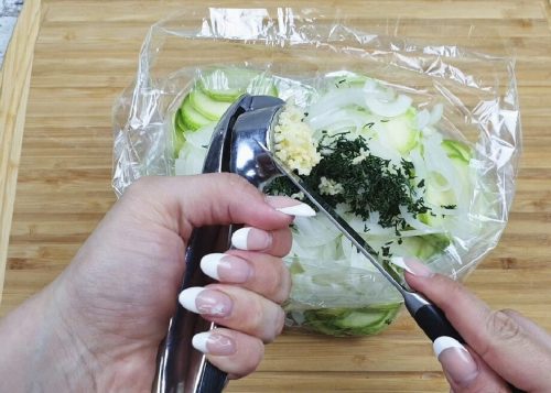 Маринованные кабачки – настоящий хит летнего меню. Для этого способа не нужна никакая посуда. Для приготовления нужны только кабачки с зеленью и специями и любой плотный пакет. Очень удобно готовить и дома на ужин или к приходу гостей, и на природе к шашлыку.