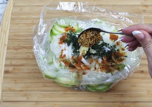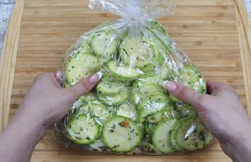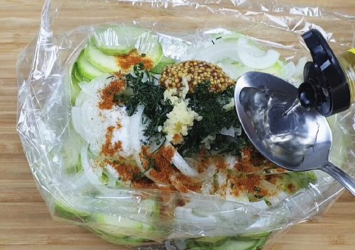 Завязываем пакет и аккуратно перетряхиваем кабачки, так чтобы все овощи и специи хорошо перемешались.