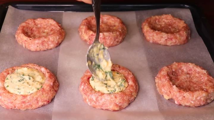 В мясных шариках сделайте углубление пальцами (или дном стакана, смоченным водой). Выложите достаточно начинки. Отправьте в духовку, разогретую до 200 градусов. Запекайте в течение 40 минут.