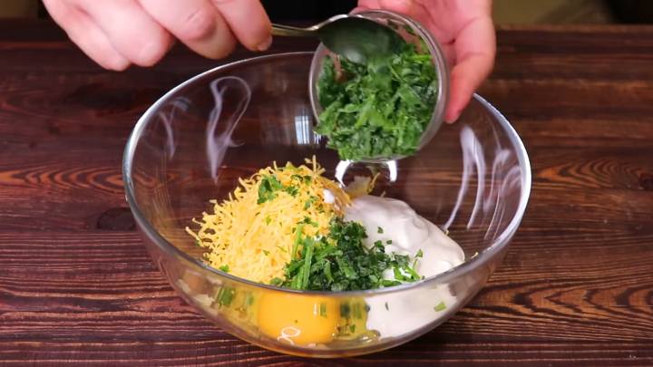 Натрите твёрдый сыр. Добавьте яйцо, любую зелень (немного), измельчённый чеснок, сметану или майонез. Перемешайте — начинка готова!