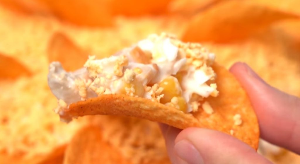 Красивый и вкусный слоеный салат с копченой курицей, яйцами, кукурузой и грибами. Украшенный чипсами в виде цветка, он станет отличной закуской на праздничном столе.