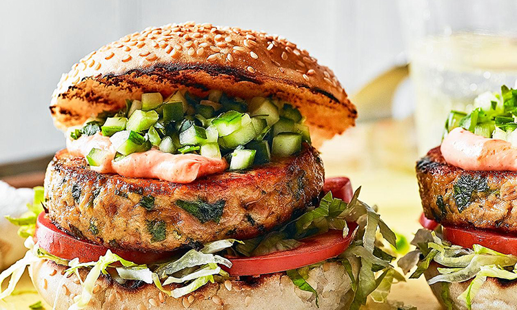 Для соуса смешайте греческий йогурт, сок лимона, тимьян, соль и перец. Разрежьте булочку пополам, положите на нее бургер из тунца, добавьте соус и свежие овощи по вкусу. Закройте второй половиной булочки и подавайте.