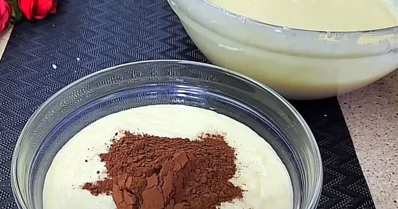 В глубокой миске манку с сахаром. Теперь вливаю кефир, перемешиваю, накрываю плёнкой на 15 минут. Вливаю масло, всыпаю просеянную муку, разрыхлитель, перемешиваю. Делю тесто на 2 равные части. В одно добавляю какао, в другую муку, замешиваю.