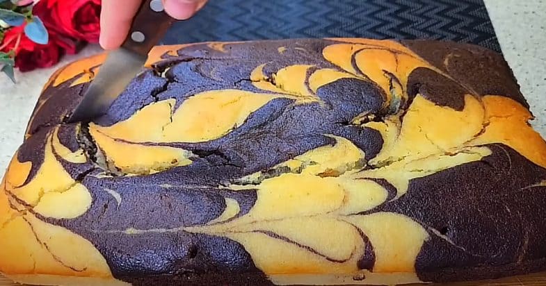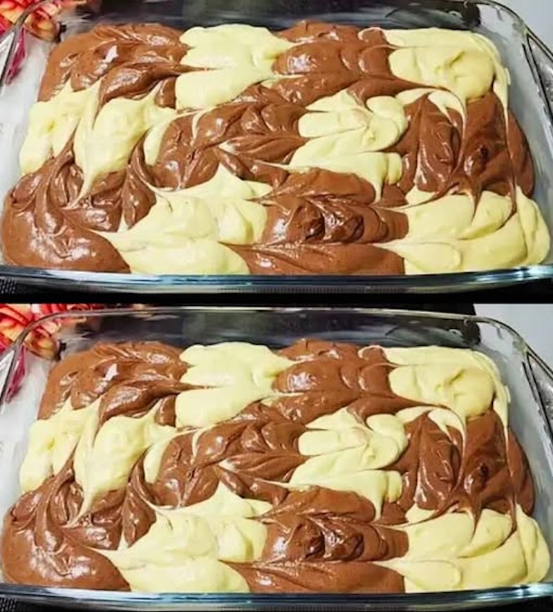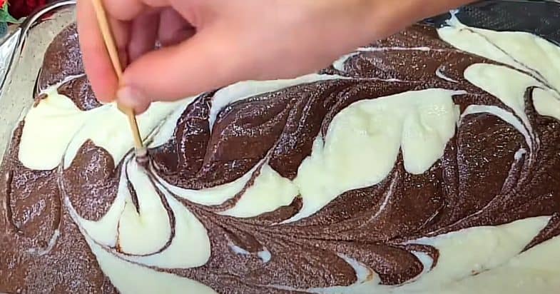 Смазываю маслом прямоугольную форму для выпечки. Выкладываю светлое и темное тесто, как в шахматах. Затем рисую узор.