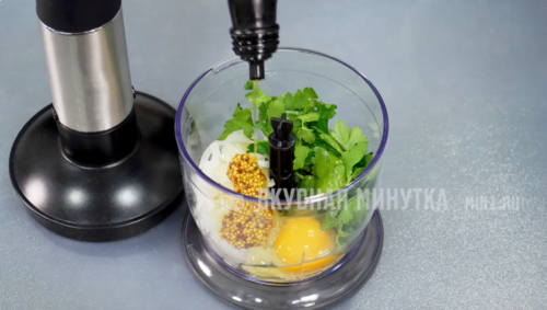 К нему отправляем петрушку, горчицу, вбиваем яйцо и вливаем масло (можно оливковое или какое-нибудь другое).