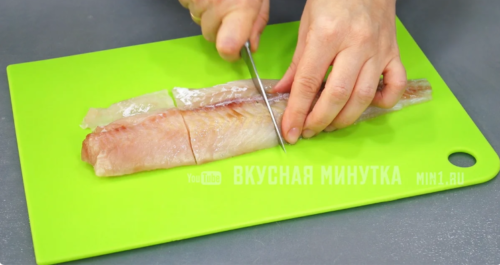 Рыба подойдет любая, главное – филе. Режем его на порционные куски.