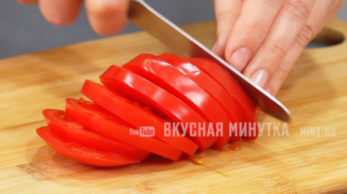 Затем режем томаты на кружки, но можете готовить рыбу без них.