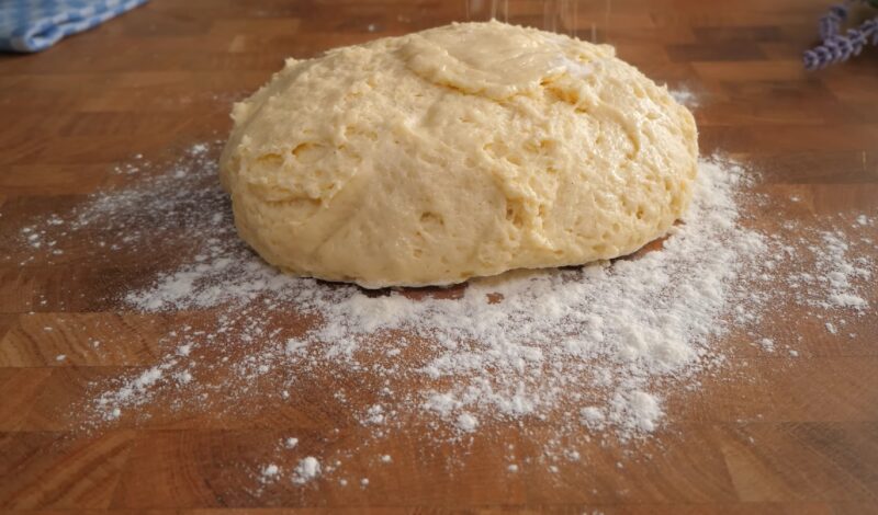 Частями введите просеянную муку, смешанную с разрыхлителем и щепоткой соли, и замесите однородное тесто.
