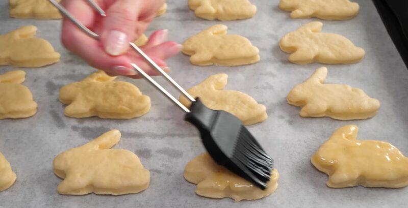 Выложите заготовки на противень, выстеленный пергаментной бумагой, и смажьте растопленным сливочным маслом (небольшое количество масла необходимо оставить).