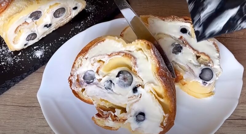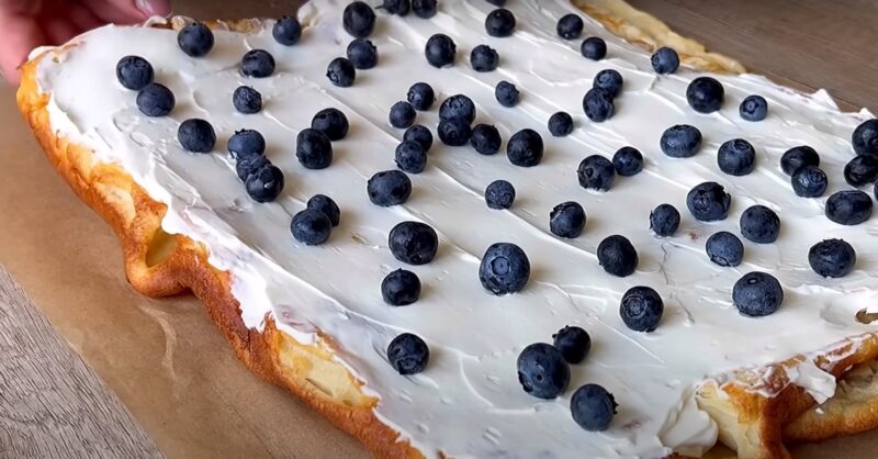 Смазываем равномерно поверхность коржа полученным кремом. Посыпаем слой крема голубикой и сворачиваем корж в рулет начинкой внутрь.