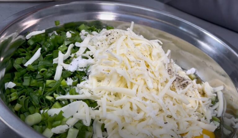 Зеленый лук мелко нарезаем. Разбиваем в него 3 яйца. Сыр, натертый на крупной терке, смесь перцев и соль добавляем к этой смеси. Всю начинку перемешиваем до однородности.