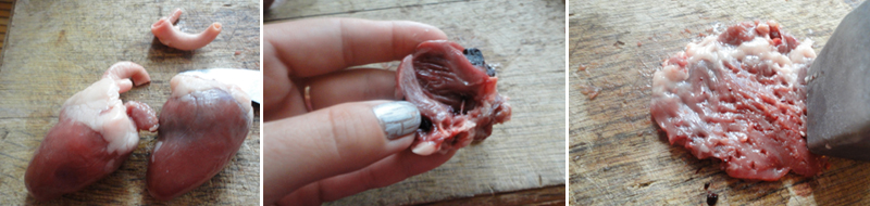 Час прошел, хорошенько моем потрошка, избавляемся от торчащих сосудов, разрезаем на две части (не полностью, сбоку оставляем соединяющий две части мостик). Легонько отбиваем продукт.