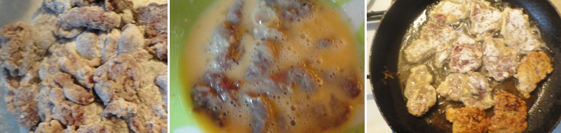 Каждое сердце «купаем» сначала в муке, затем в яичной смеси. Жарим до появления аппетитного румяного оттенка. Долгий процесс жарки сделает структуру отбивной жесткой, так что следите за временем.