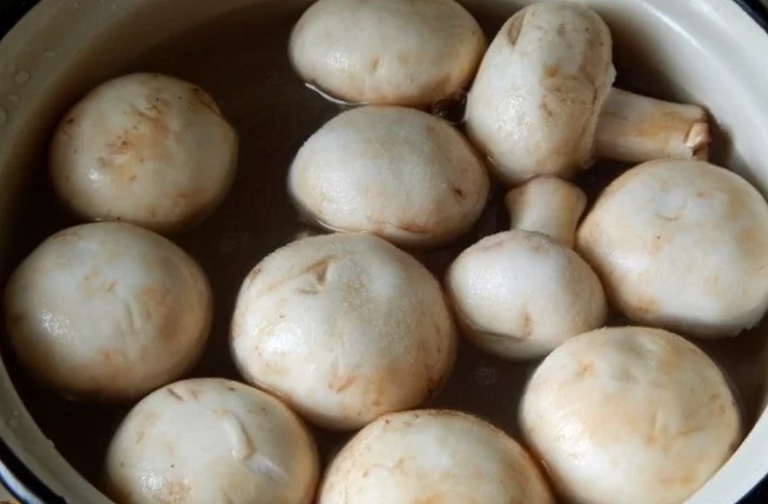 Шампиньоны хорошо помыть, залить водой в кастрюле и добавить соли, чайную ложку. Чтобы в заготовке они были вкусны, мы их проварим сначала. Шампиньоны закипели и минут 15 пусть проварятся. Затем их нужно выловить шумовкой, дать немного охладиться и нарезать тонкими кусочками.