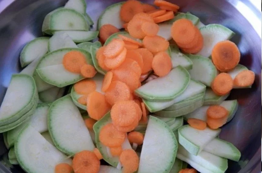 Кабачок и морковь помыть, обрезать хвостики у кабачка, морковь поскребите ножом. Нарезаем тонкими полукольцами кабачок, а морковь тоненькими кольцами или на терочку. Высыпаем в одну большую емкость.