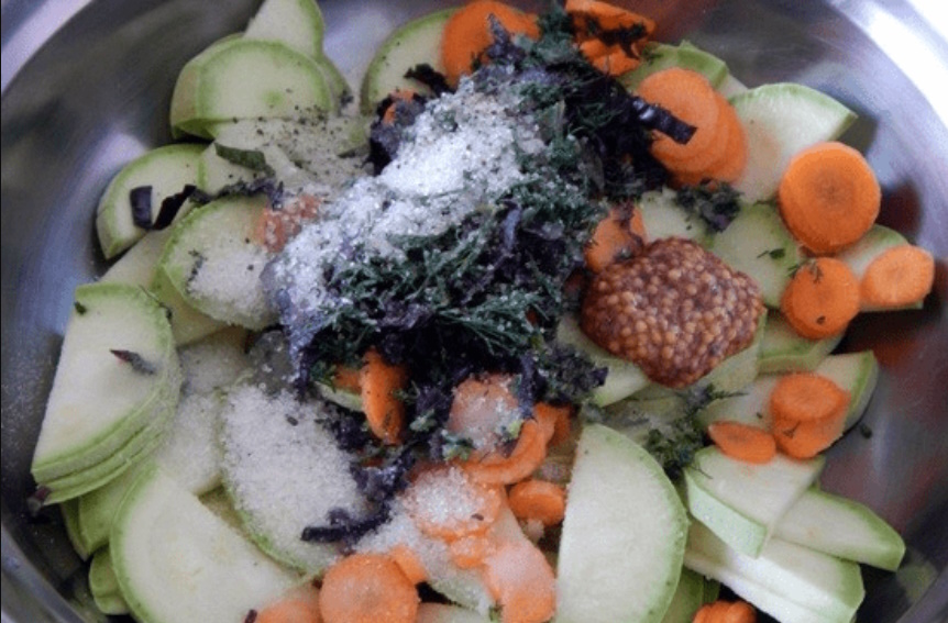 Свежий укроп и базилик мелко порежем и добавим к овощам. Еще посыпаем их солью, сахаром, свежайшим молотым перцем и немного добавляем дижонской горчицы.