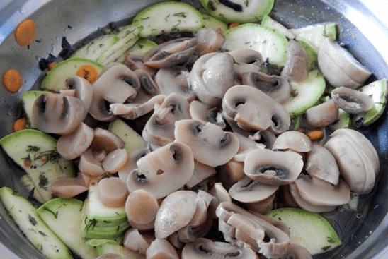 Сегодня приготовим салат из кабачков и грибов. Самый распространенный гриб – шампиньоны. Грибы чуть-чуть отварить, а кабачки свежими замаринуем с приправами, чтобы они пустили сок. Потом все смешаем и салат готов!