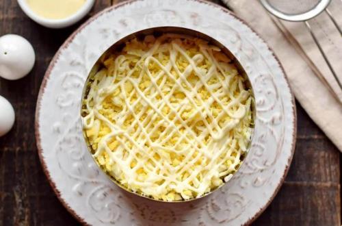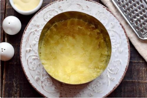 Первым слоем будет тертая картошка. Утрамбовать ее ложкой, посолить и сделать довольно густую сеточку из майонеза, распределить ложкой.