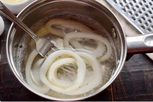 Далее необходимо закипятить воду в кастрюле и опустить в нее кальмары. Время варки – 1-2 минут, а после слить воду.