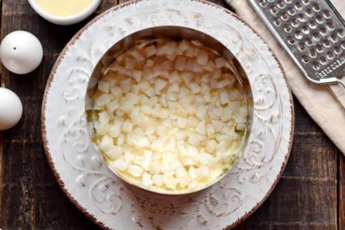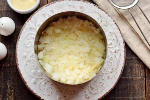 С лука снять шелуху, мелко нашинковать, залить кипятком и оставить на 3-4 минуты. Эта процедура избавит овощ от горечи. После этого переложить лук на сито и дать полностью стечь воде. Затем выложить сверху кальмаров и тоже смазать майонезом.