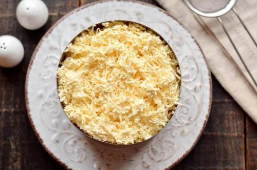 Предварительно плавленые сырки нужно заморозить, чтобы потом было легче натирать. Сырки мелко натереть сразу сверху яиц и разровнять. Вместо плавленых сырков можно взять твердый сыр.