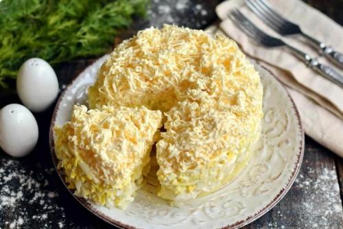 Выкладывается салат слоями, которые промазываются майонезом. Ингредиенты можно, как нарезать в виде кубиков, так и натереть с помощью терки. Такой салат станет прекрасным вариантом для праздничного стола, ведь он сытный, нежный и невероятно вкусный.