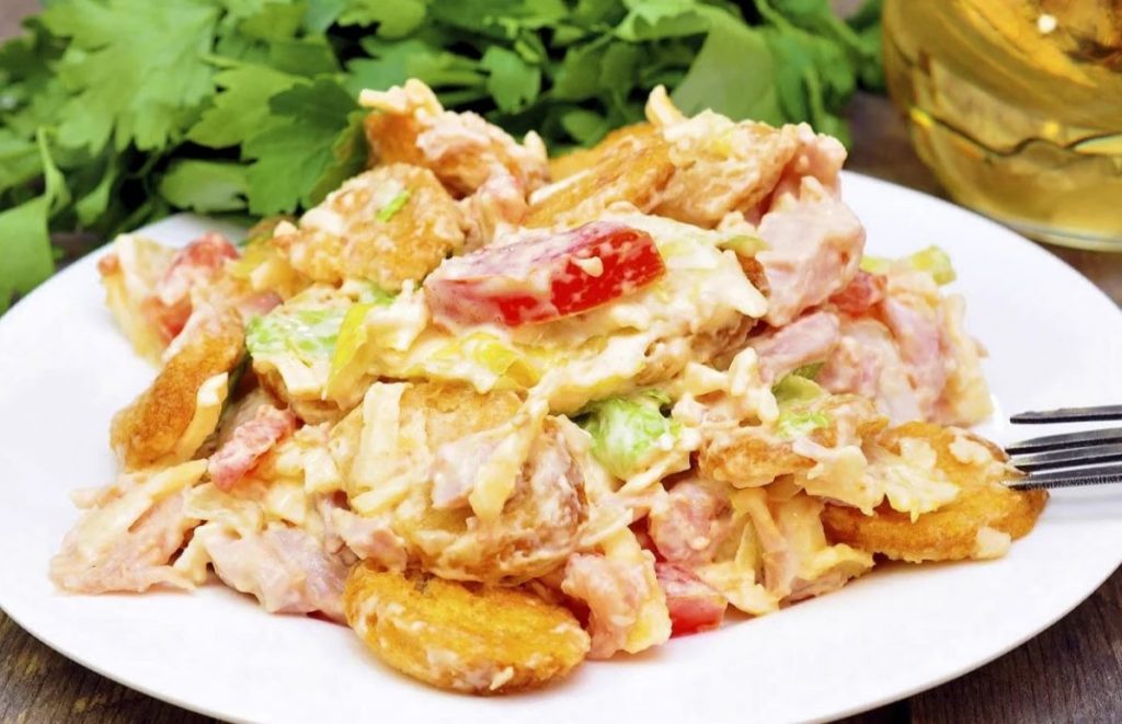Как и многие салаты, рецептами которых я с вами делюсь, этот мы будем делать из минимума обычных продуктов. Зато на выходе у вас будет красивый, вкусный и сытный салат, которому место на обычном и праздничном столе.