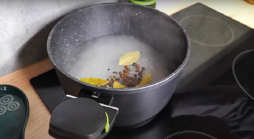 Чтобы приготовить сало в рассоле, возьми большую кастрюлю, в которой и будет вариться рассол. Вылей туда воду, добавь соль, лаврушку, перец горошком и приправу. Всё это поставь на средний огонь и доведи до кипения. После того как рассол закипит, оставь его на плите еще на несколько минут повариться.