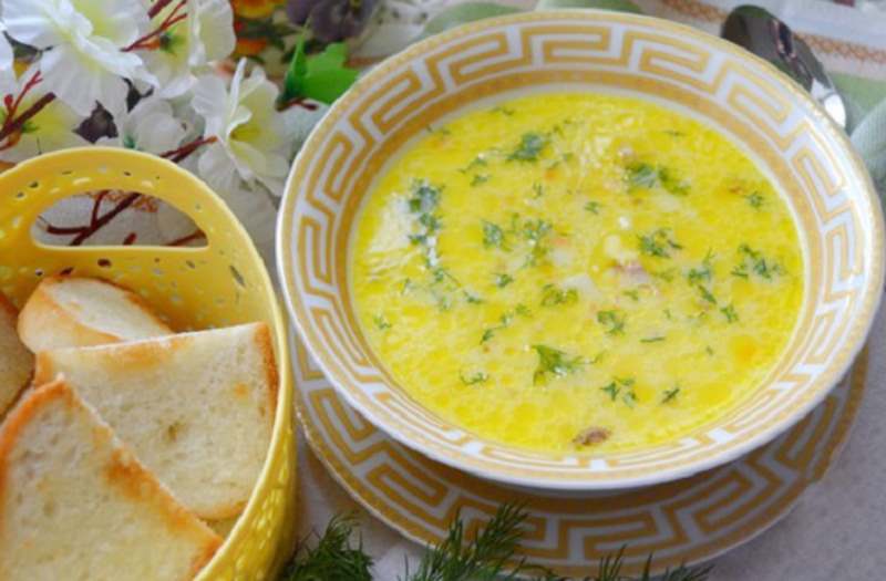 - Добавить в суп зажарку и плавленый сыр, довести до кипения и выключить огонь. При подаче украсить суп зелень и поперчить по вкусу.