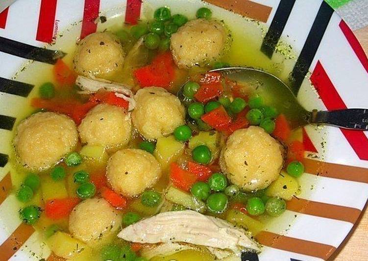 Лёгкий куриный суп с сырными кнедлями и зеленым горошком