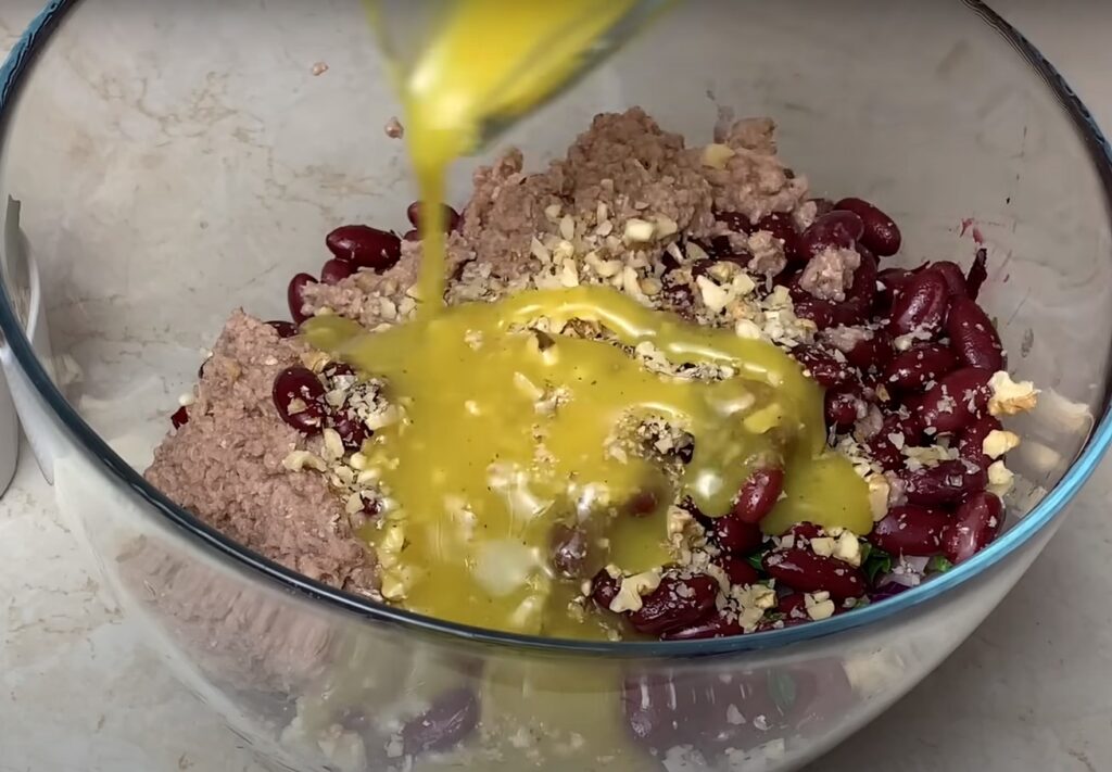 Шинкуем мелко петрушку, выкладываем в салат вместе с консервированной фасолью. Кладем в салат консервированную рыбу, измельчаем туда же орехи.