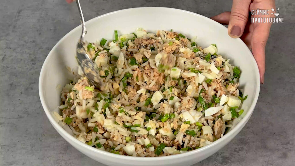 Добавляю 300 граммов отварного риса, 5 яиц (я их уже заранее порезала) и небольшой пучок зеленого лука. Солим, перчим по вкусу и перемешиваем. Обязательно попробуйте на соль — начинка должна быть слегка пересоленой. Вместо свежего зеленого лука вы можете взять замороженный или сушеный.