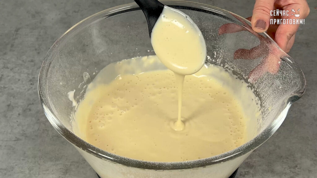 Теперь добавляю 170 граммов муки (я уже заранее ее просеяла) и пакетик разрыхлителя (это 10 граммов). Замешиваю тесто — миксером, конечно, не обязательно, можно просто венчиком или вилкой. Тесто должно получиться что-то среднее между тестом на блины и тестом на оладьи.