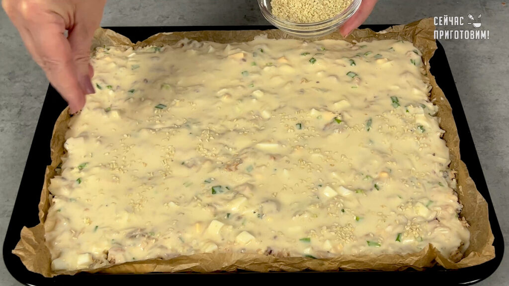 Сверху прикрываю также тонким слоем теста и посыпаю кунжутом.
