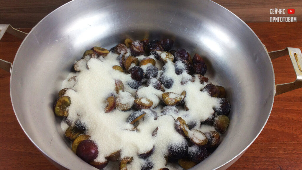 Мою сливы, сушу и разрезаю пополам, вытаскиваю косточки. Сливы складываю в кастрюлю, засыпаю сахаром и оставляю на 5-6 часов, чтобы выделился сок.