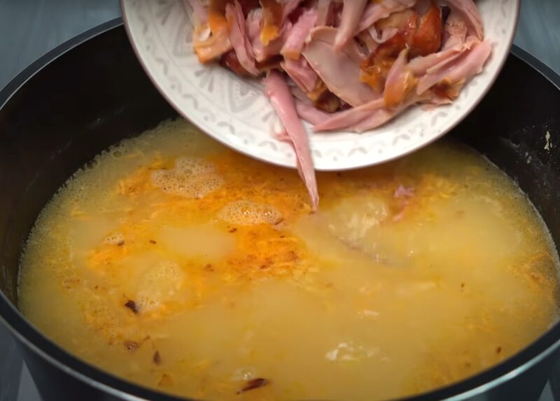 Отдельно разделяем мясо от кости на куриных ножках, кладем в суп и варим 3-4 минуты.