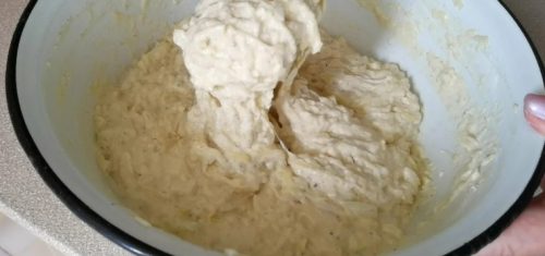 После этого в тесто добавляю просеянную муку и хорошо перемешиваю. Консистенция теста должна быть как у густых оладий.