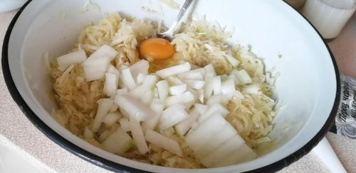 Далее добавляю мелко нарезанный лук и вбиваю одно яйцо. Все хорошо перемешиваю. Именно лук придает нашим оладьям вкус, напоминающий беляши.