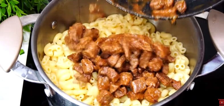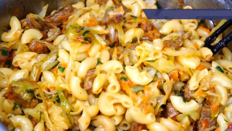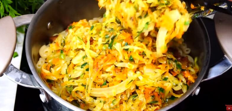 И отварим макароны в подсоленной воде до готовности. Готовые макароны сливаем, добавляем мясо и капусту.