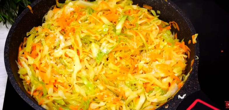 На сковороду наливаем растительное масло, кладем капусту, как капуста уменьшится в объеме, добавляем морковь и тушим до готовности капусты, по времени занимает 10-15 минут.