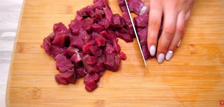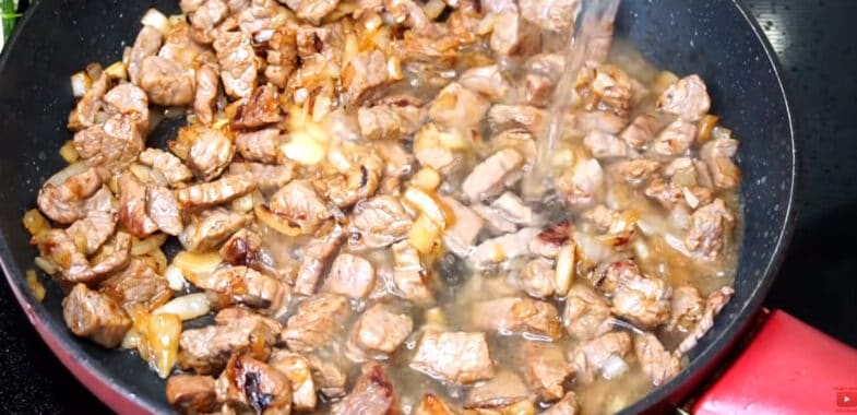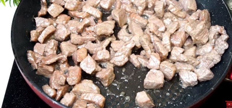 На сковороду наливаем растительное масло, кладем мясо и жарим до испарения жидкости 5-8 минут.