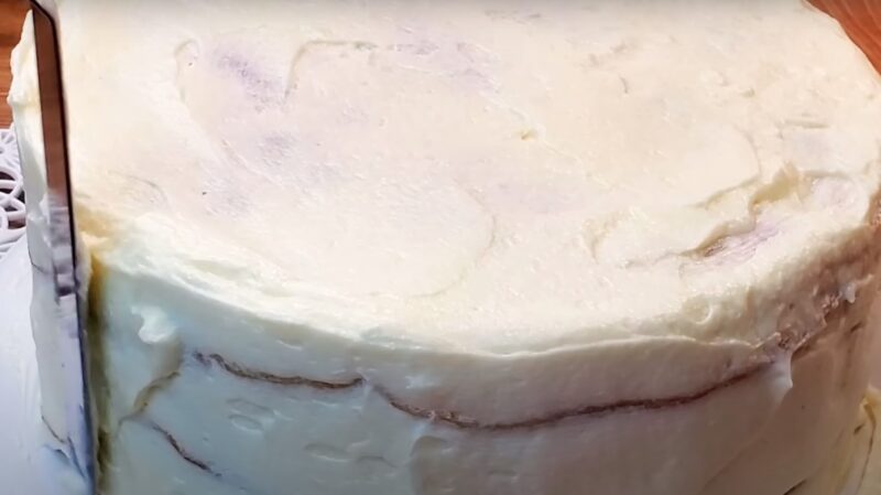 Накрываем кремовый слой вторым коржом — и так формируем торт. Бока и верхушку торта обильно смазываем остатками крема.