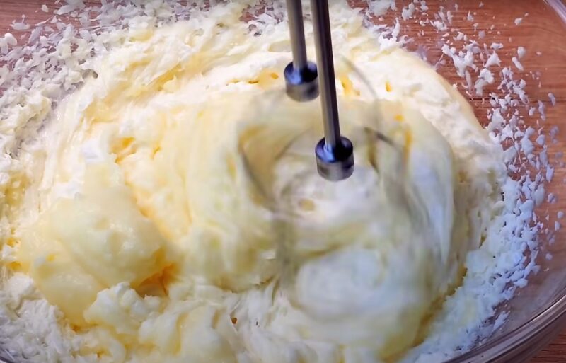 Мягкое сливочное масло взбиваем миксером до пышности — это необходимо для крема. Частями добавляем заварную основу в сливочное масло, взбиваем до объединения компонентов.